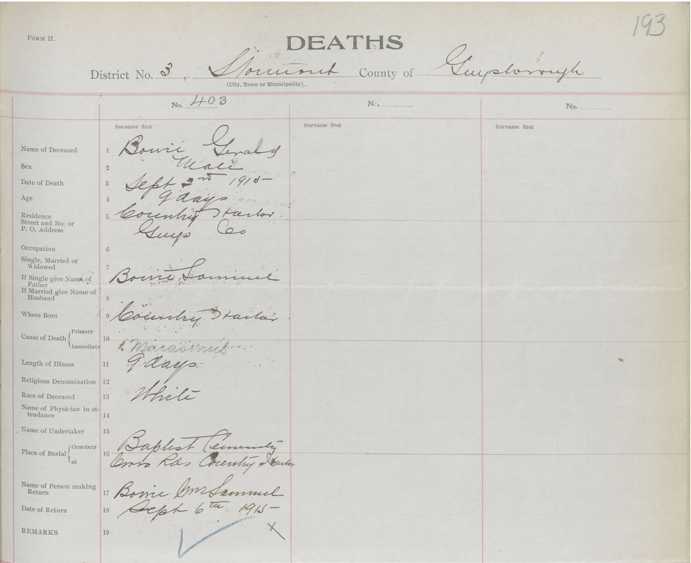 Male Death Registration: Year: 1915 book: 38 page: 193 number: 403