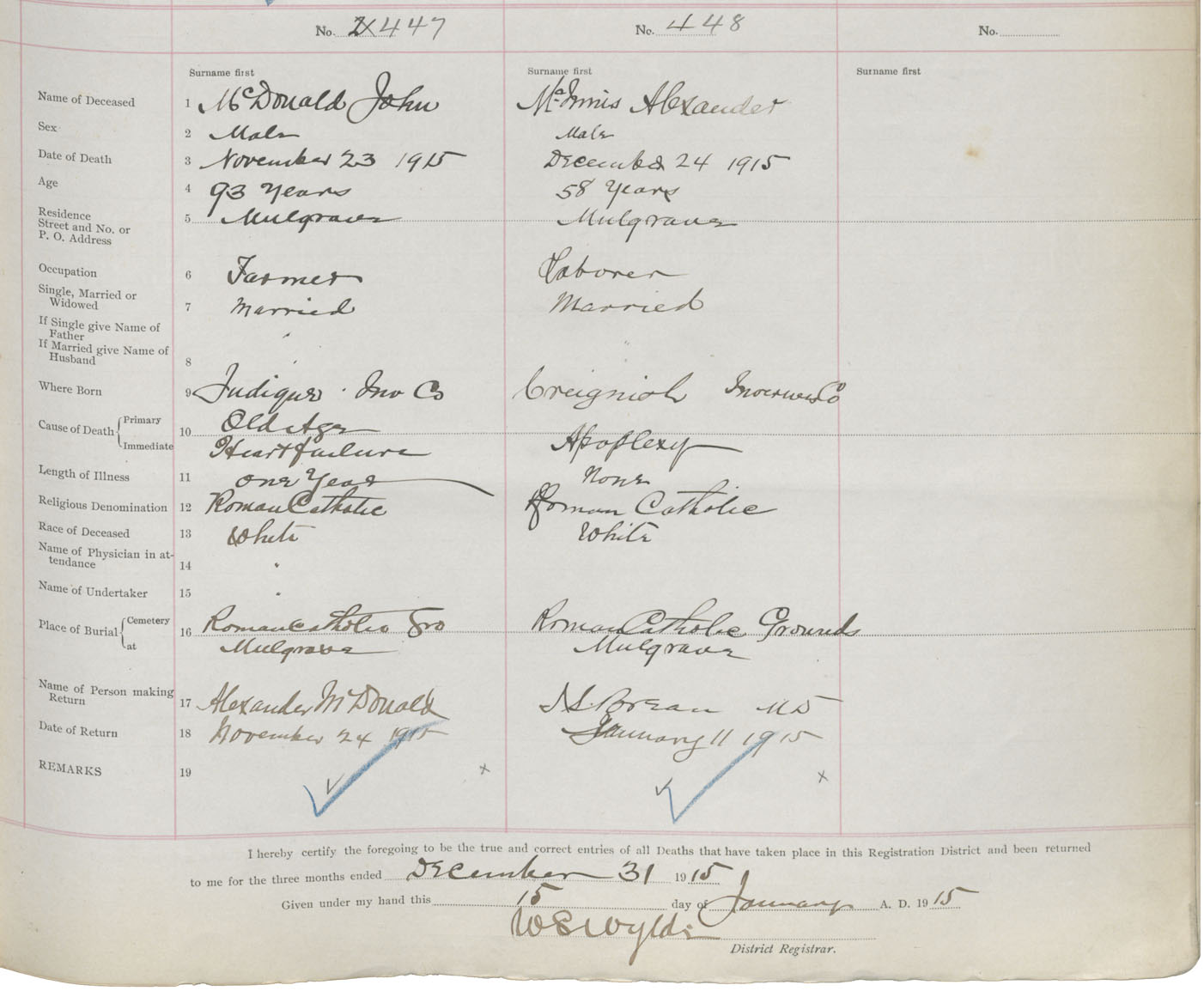 Male Death Registration: Year: 1915 book: 38 page: 221 number: 448