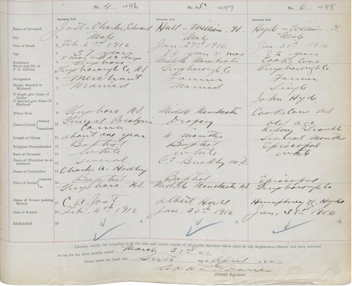 Male Death Registration: Year: 1916 book: 38 page: 257 number: 498