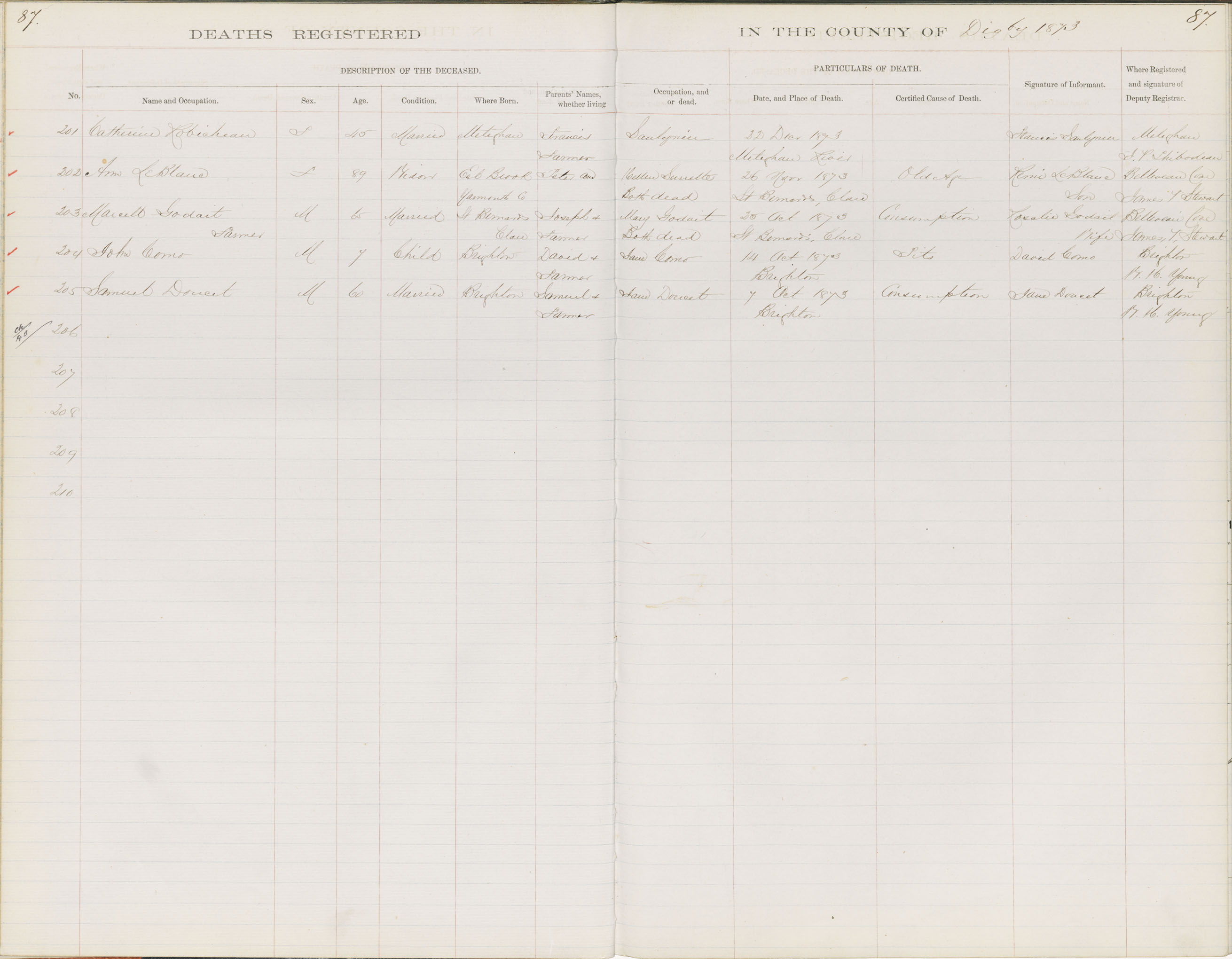 Death Registration: Year: 1873 book: 1806 page: 87 number: 201