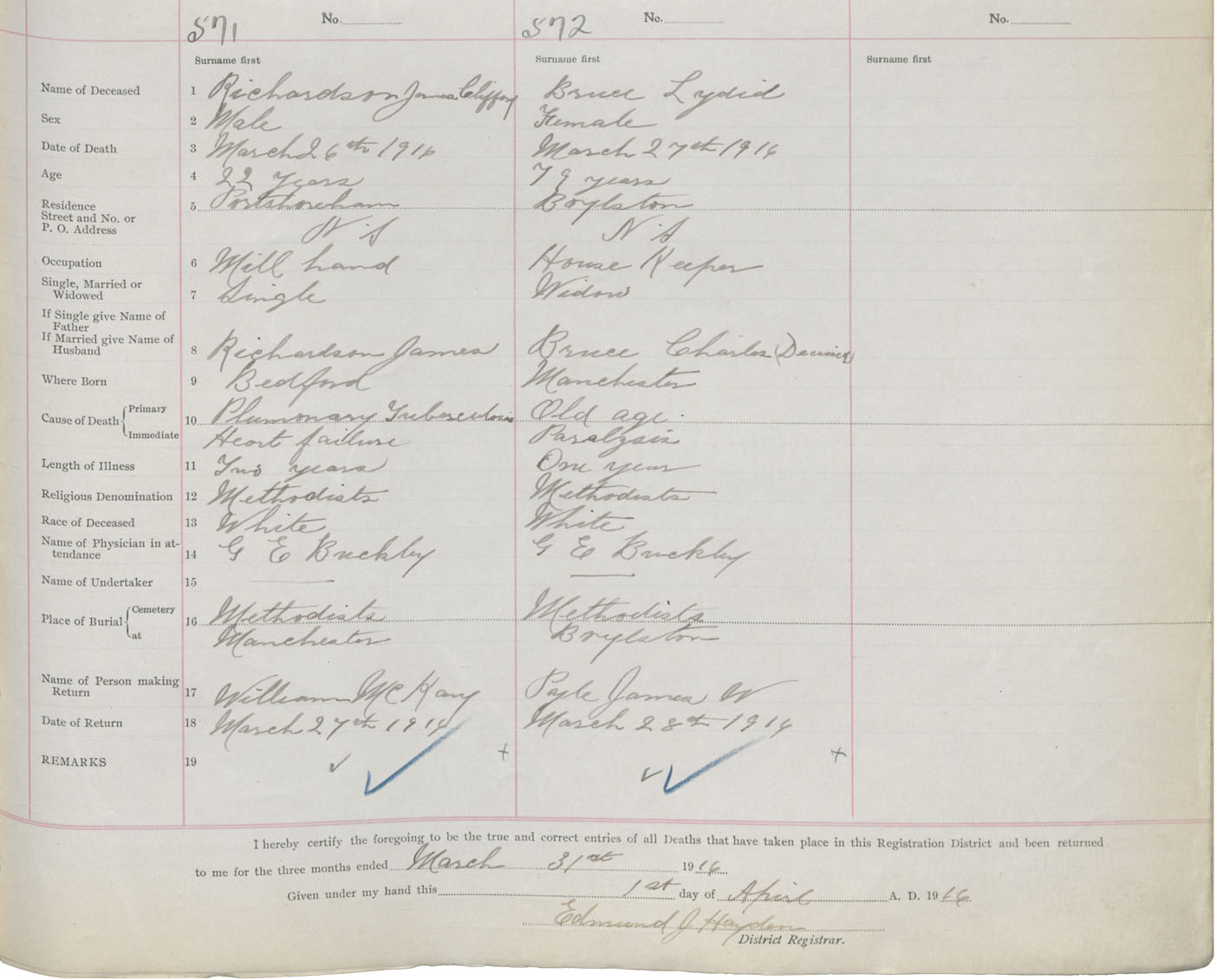Female Death Registration: Year: 1916 book: 38 page: 291 number: 572