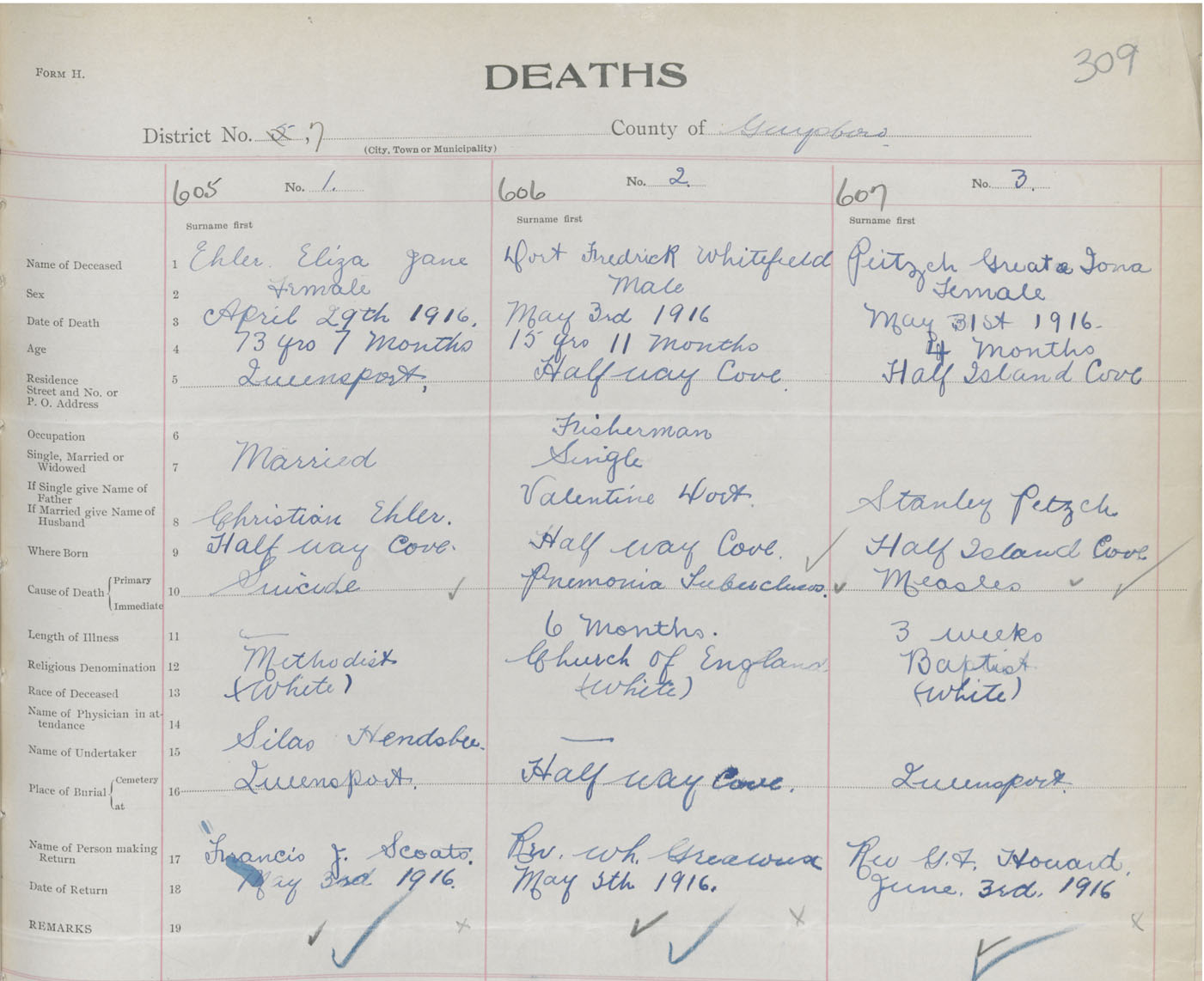 Female Death Registration: Year: 1916 book: 38 page: 309 number: 607