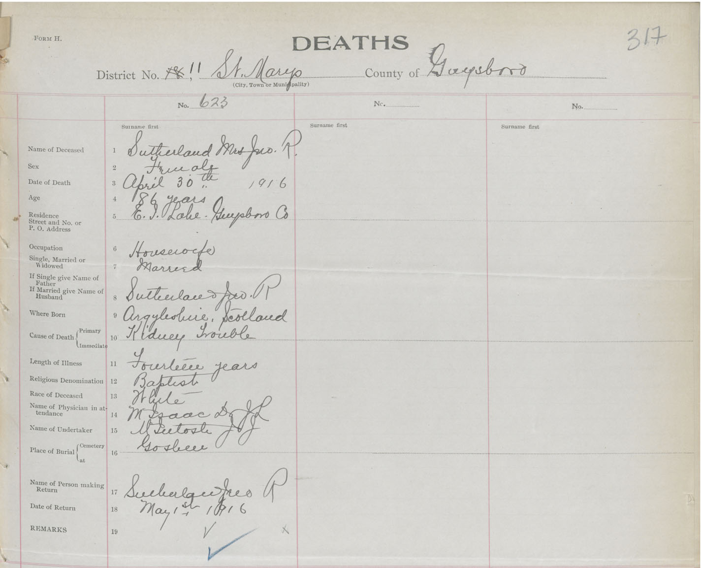 Female Death Registration: Year: 1916 book: 38 page: 317 number: 623