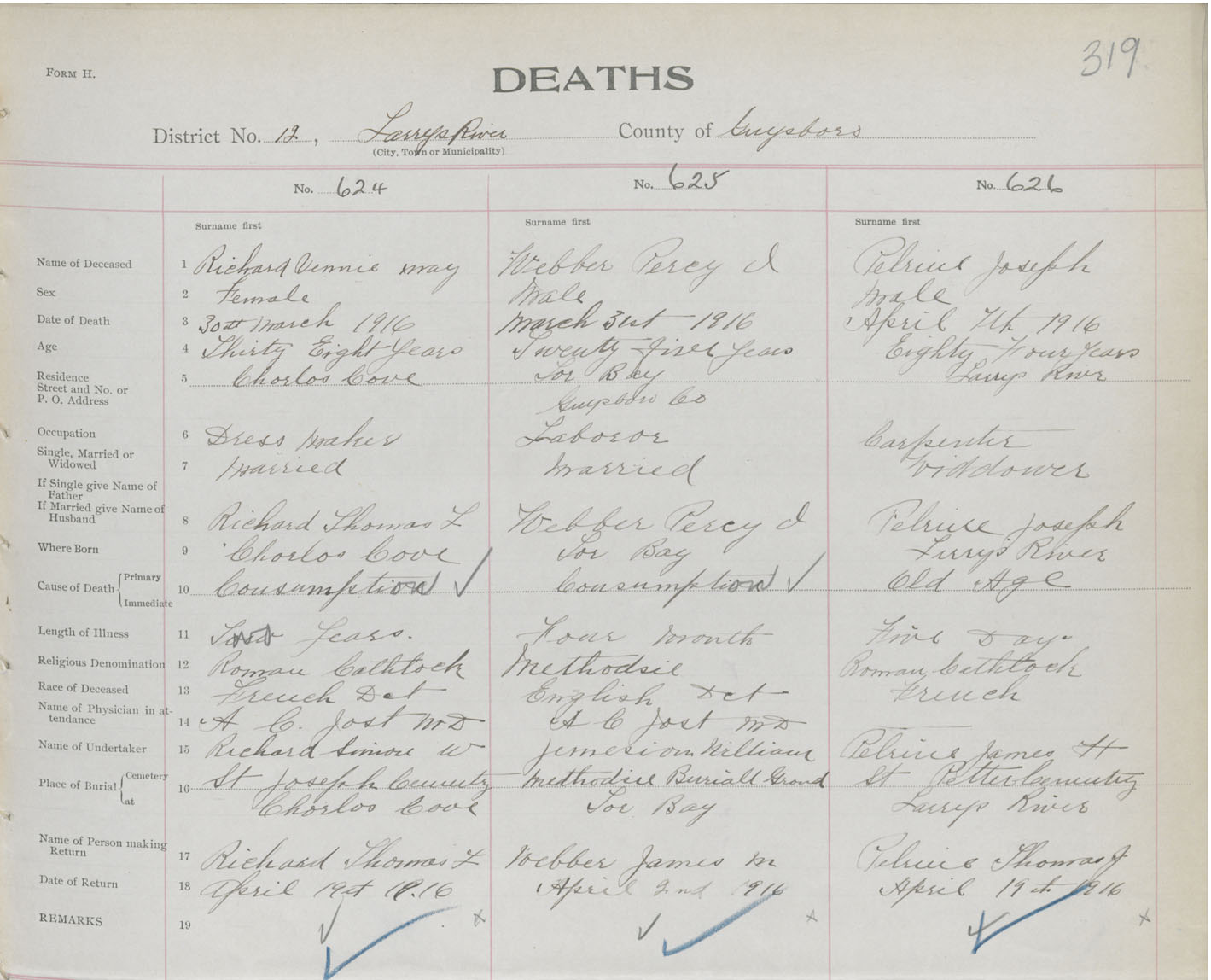 Male Death Registration: Year: 1916 book: 38 page: 319 number: 626