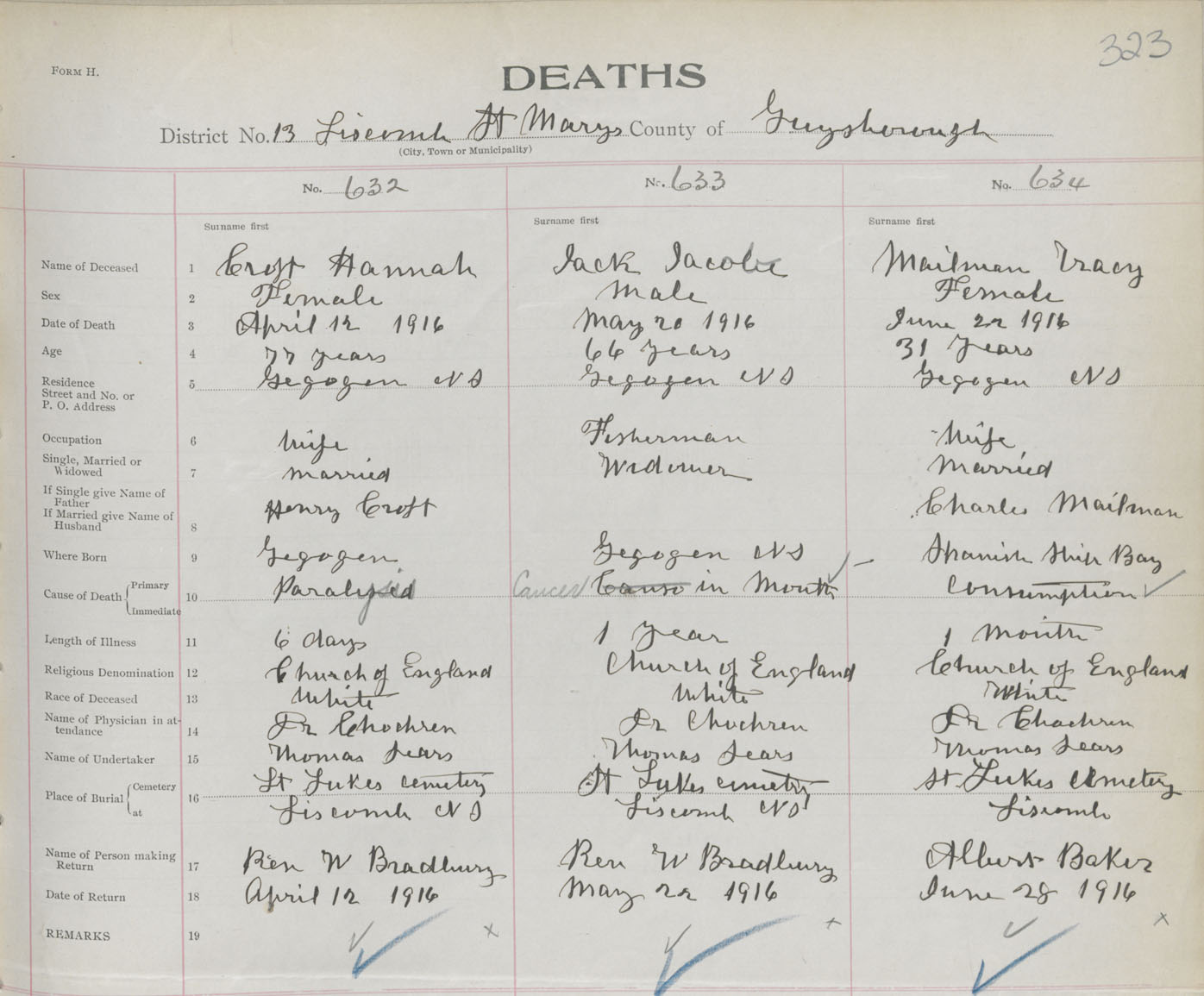 Female Death Registration: Year: 1916 book: 38 page: 323 number: 634