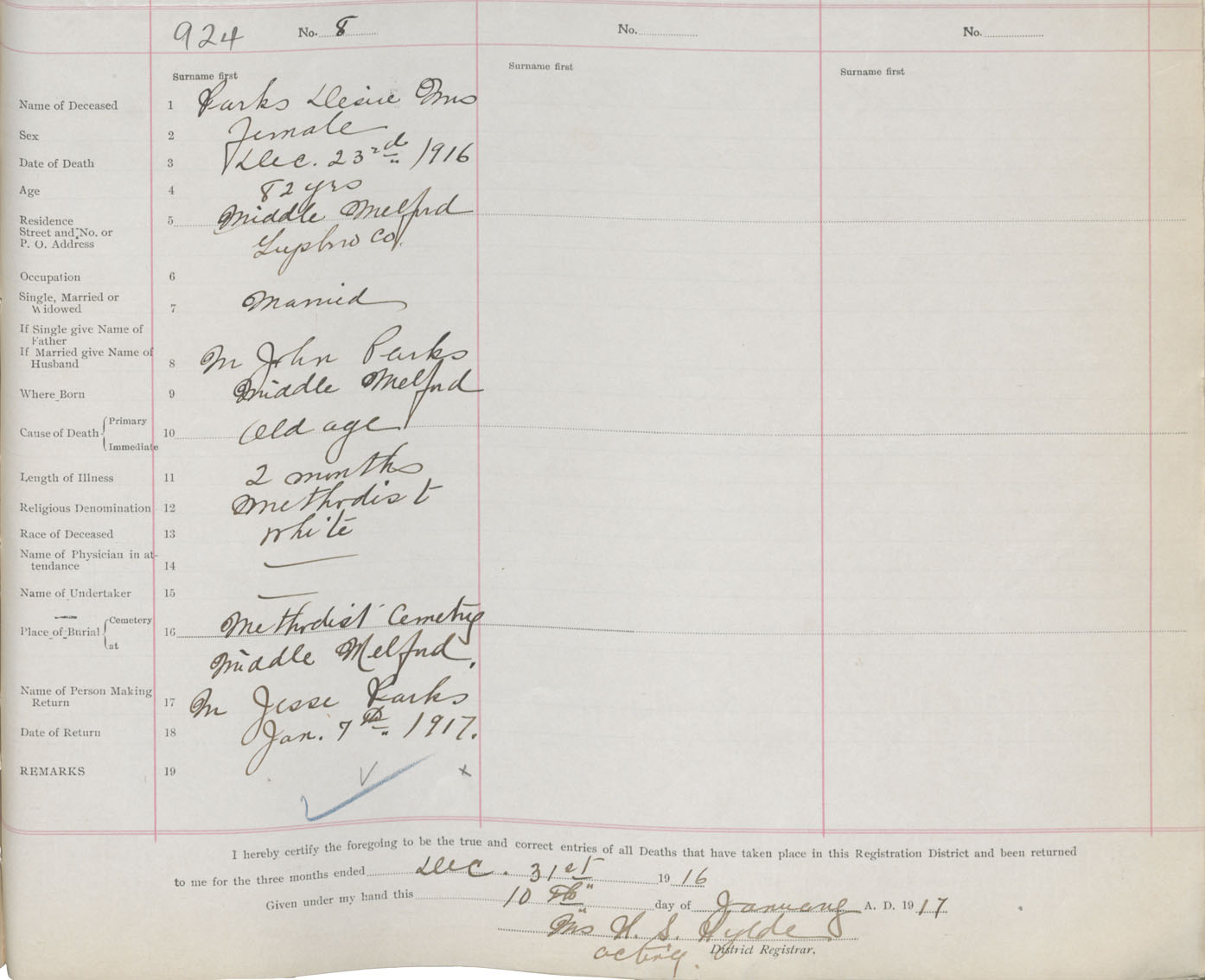 Female Death Registration: Year: 1916 book: 38 page: 495 number: 924