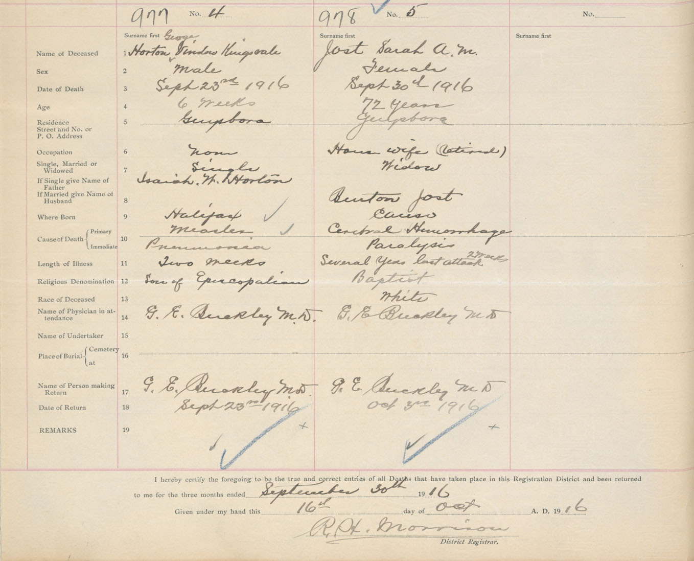 Male Death Registration: Year: 1916 book: 38 page: 526 number: 977