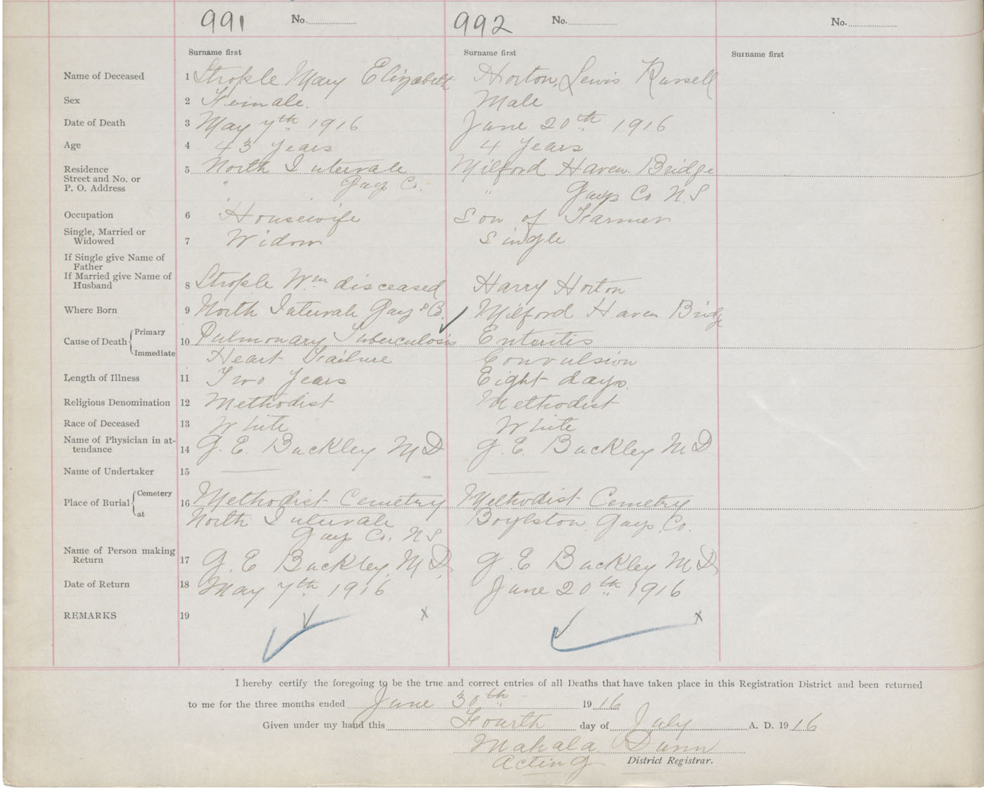 Female Death Registration: Year: 1916 book: 38 page: 532 number: 991