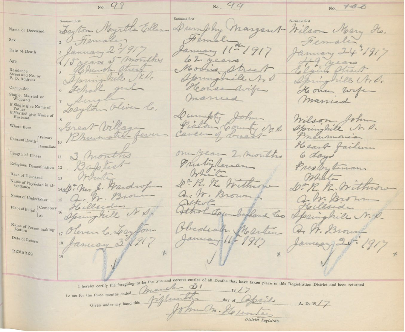 Female Death Registration: Year: 1917 book: 39 page: 23 number: 98
