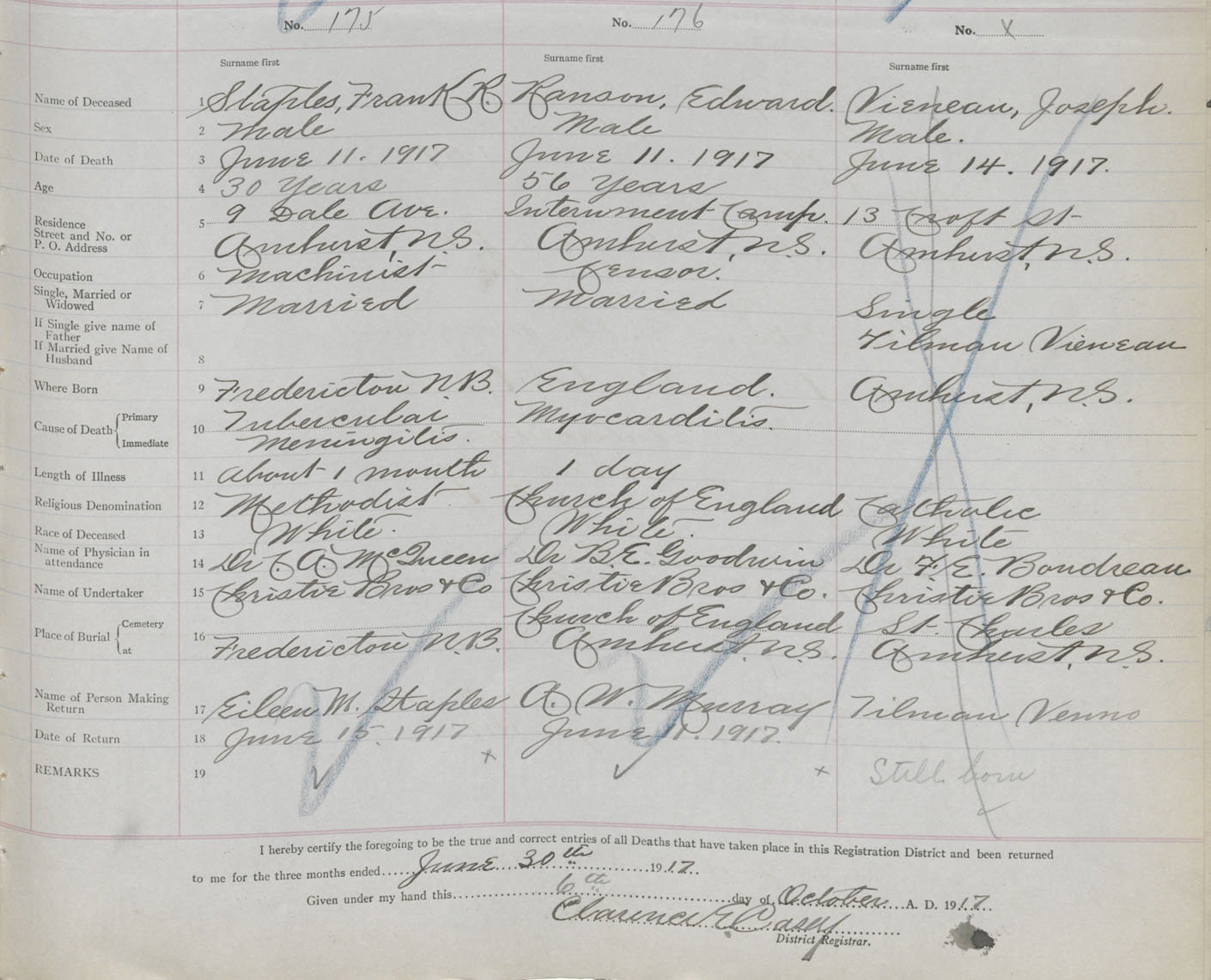 Male Death Registration: Year: 1917 book: 39 page: 41 number: 175