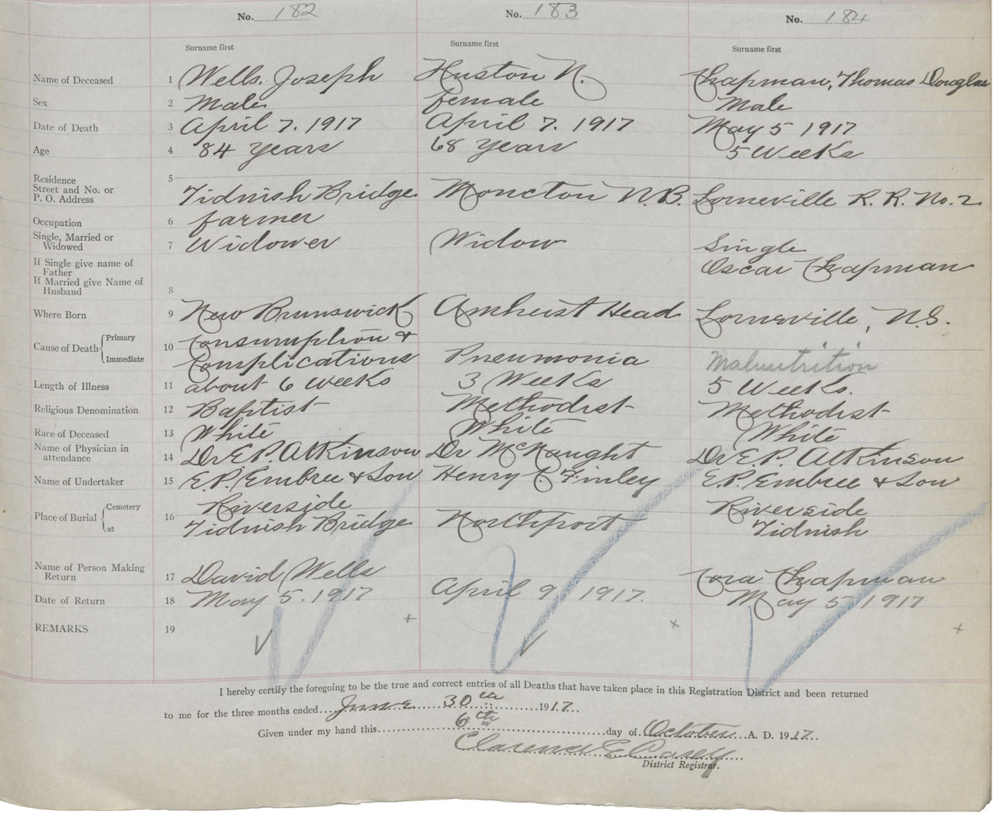 Male Death Registration: Year: 1917 book: 39 page: 43 number: 182