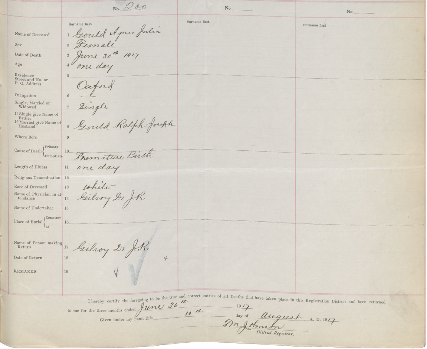 Female Death Registration: Year: 1917 book: 39 page: 49 number: 200