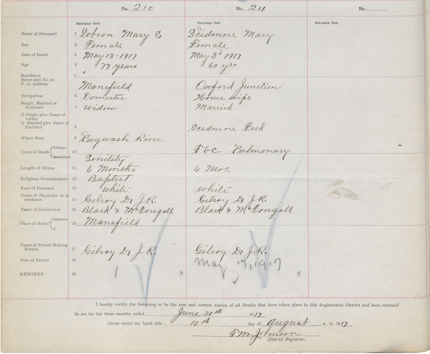 Female Death Registration: Year: 1917 book: 39 page: 52 number: 210