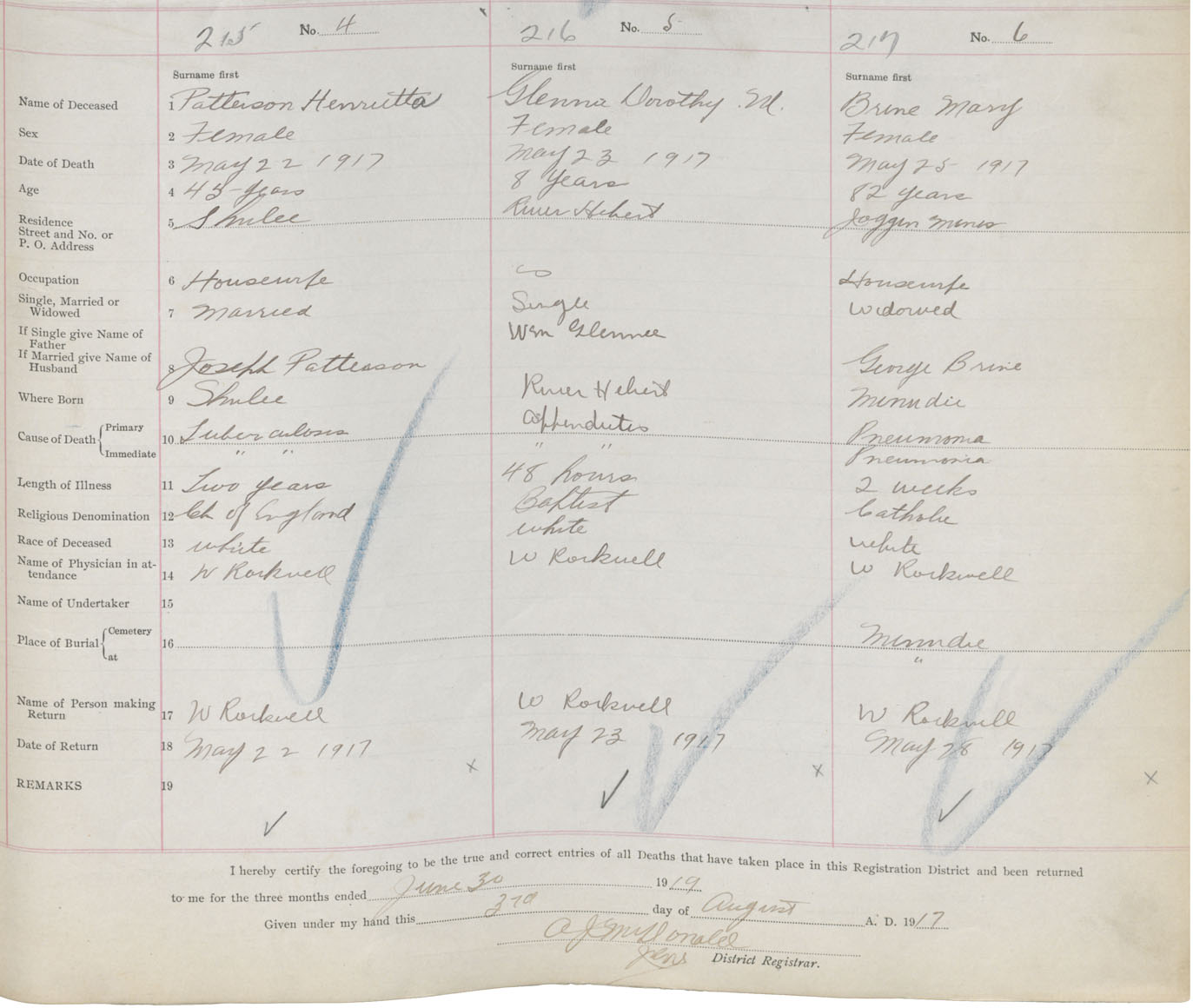 Female Death Registration: Year: 1917 book: 39 page: 53 number: 215