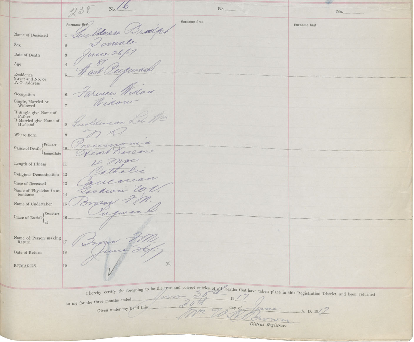 Female Death Registration: Year: 1917 book: 39 page: 59 number: 238