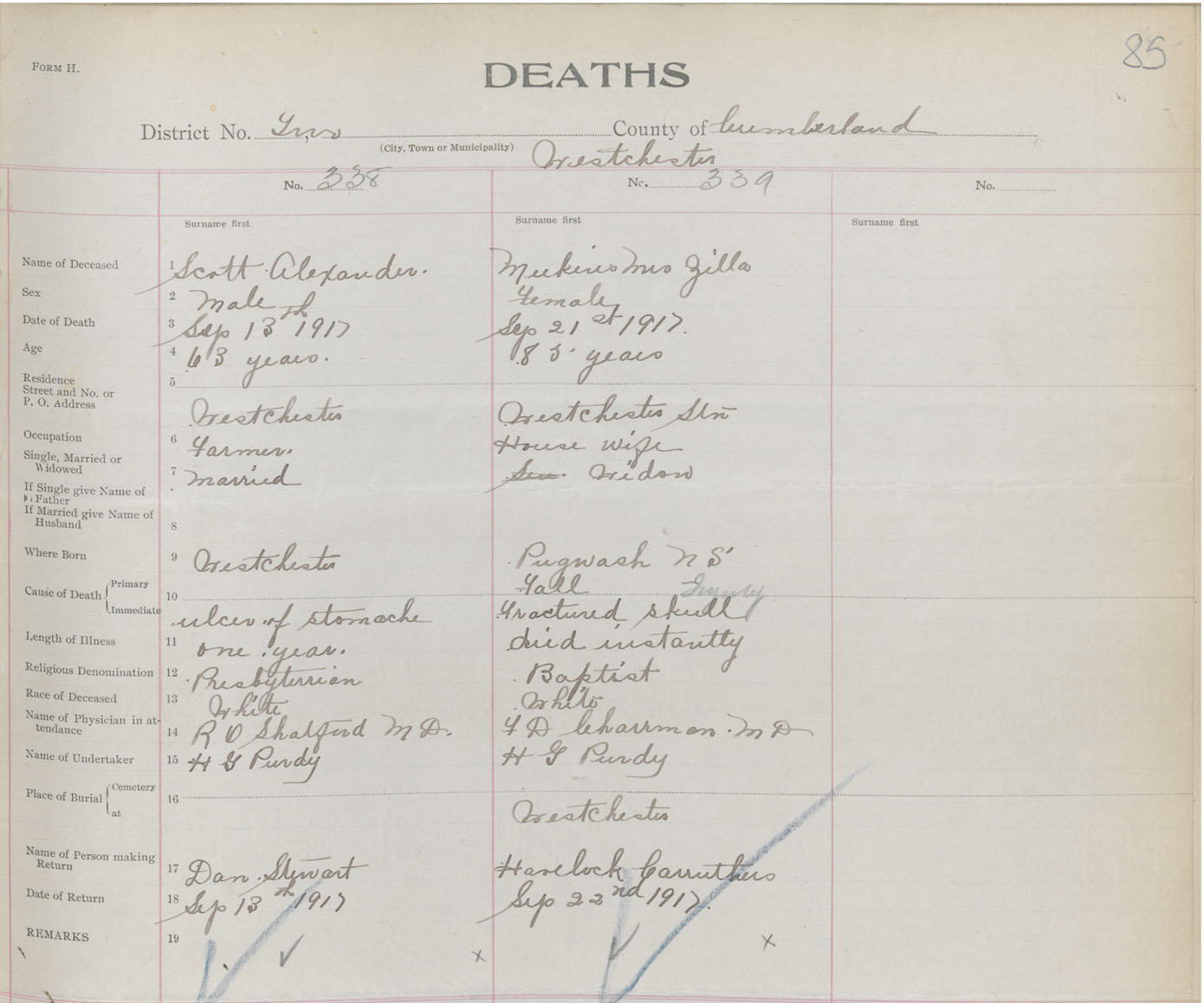 Female Death Registration: Year: 1917 book: 39 page: 85 number: 339