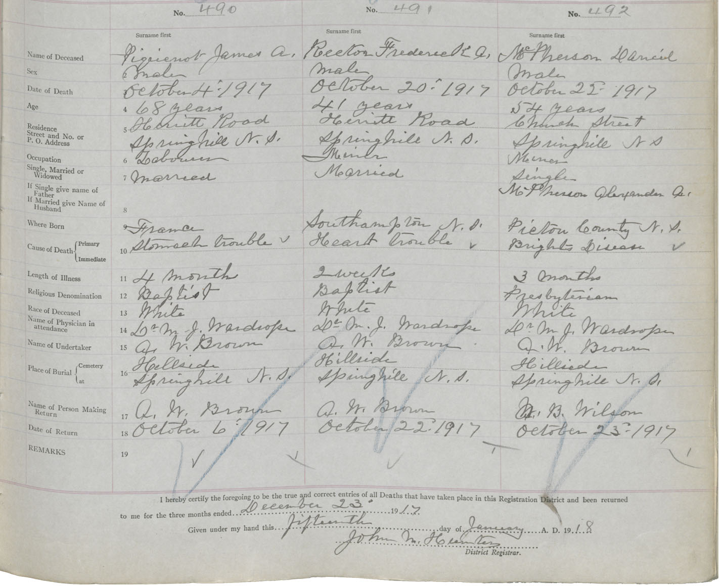 Male Death Registration: Year: 1917 book: 39 page: 127 number: 492