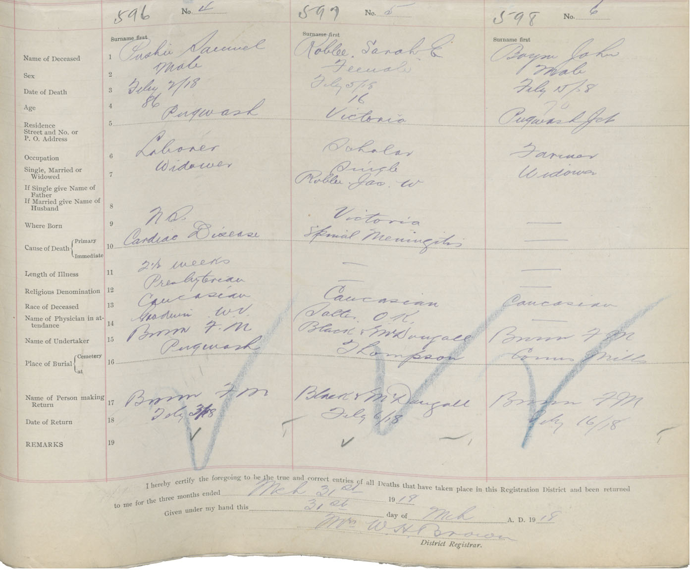 Male Death Registration: Year: 1918 book: 39 page: 157 number: 596