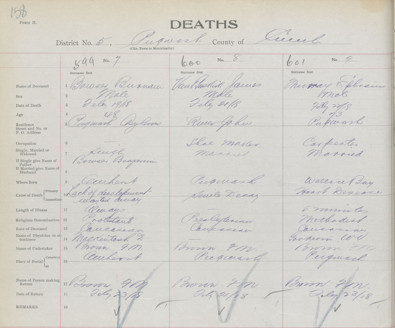 Male Death Registration: Year: 1918 book: 39 page: 158 number: 599