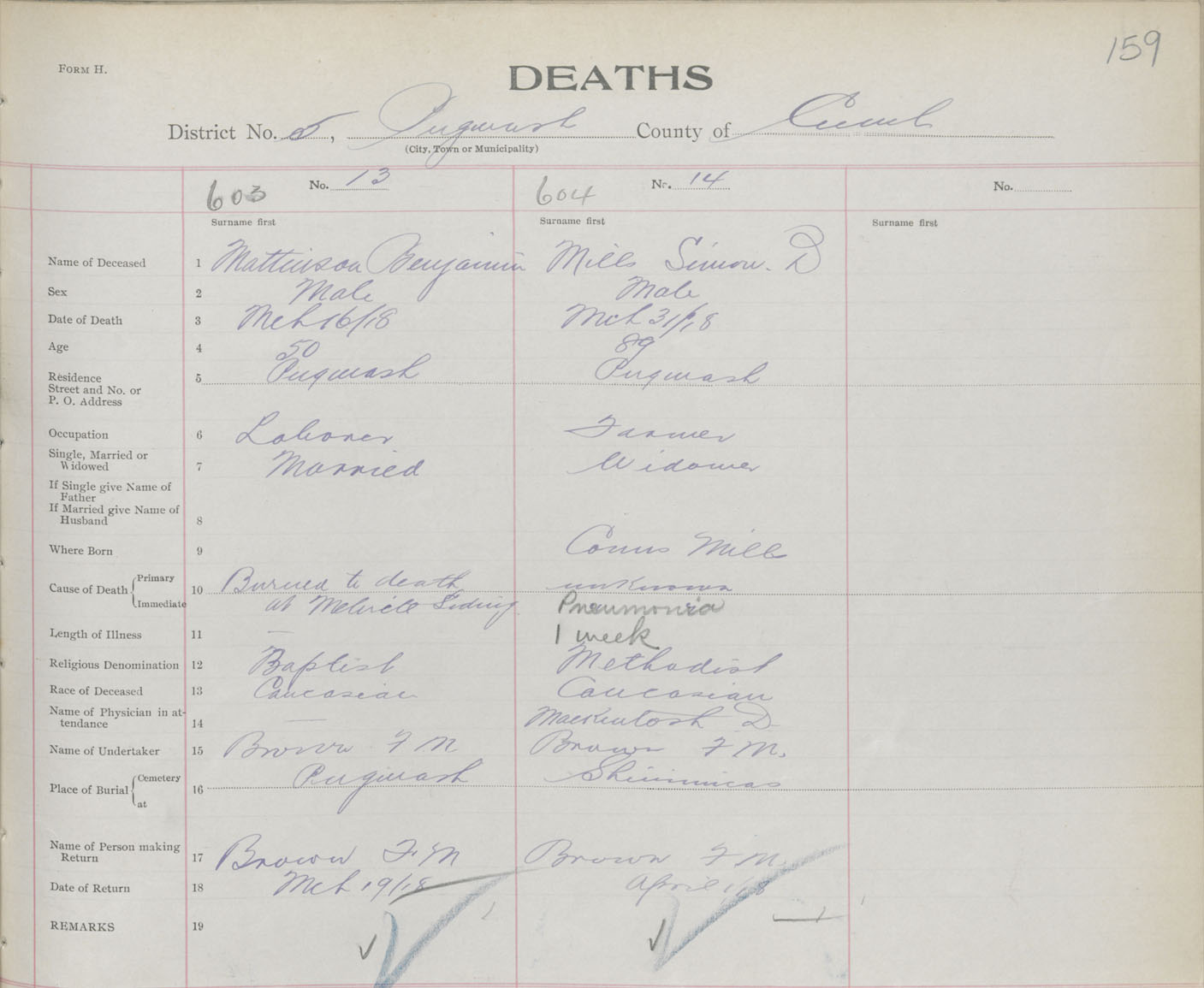 Male Death Registration: Year: 1918 book: 39 page: 159 number: 603