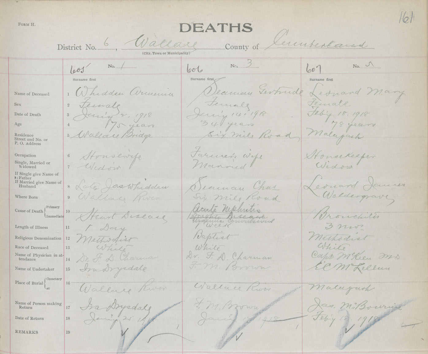Female Death Registration: Year: 1918 book: 39 page: 161 number: 605