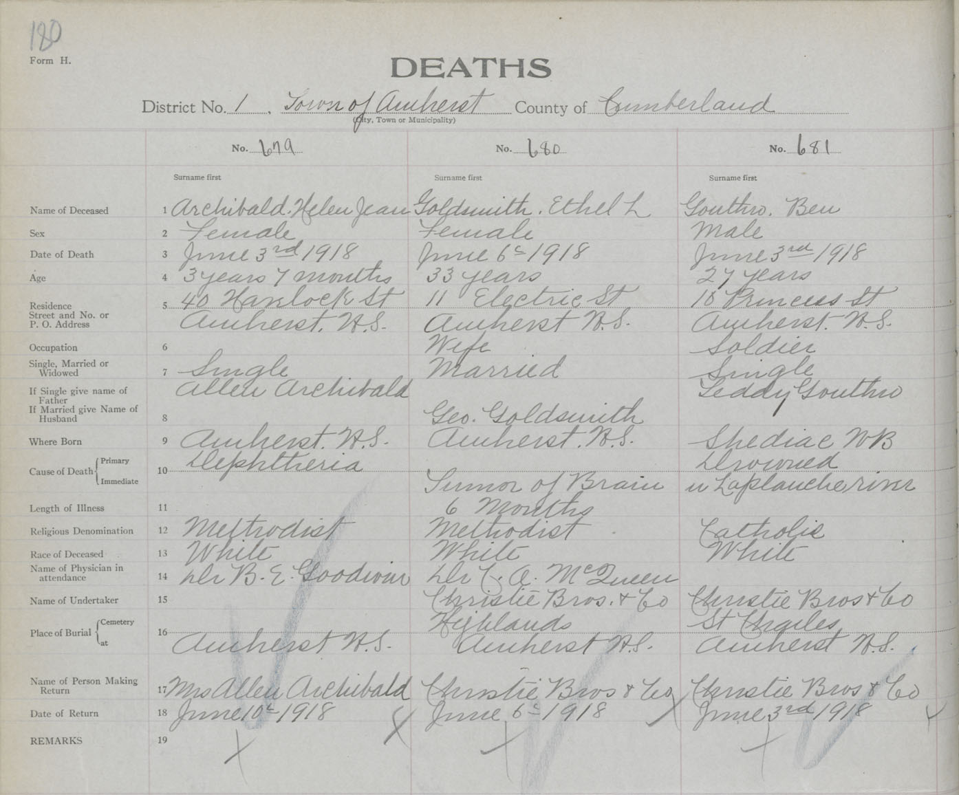 Female Death Registration: Year: 1918 book: 39 page: 180 number: 679