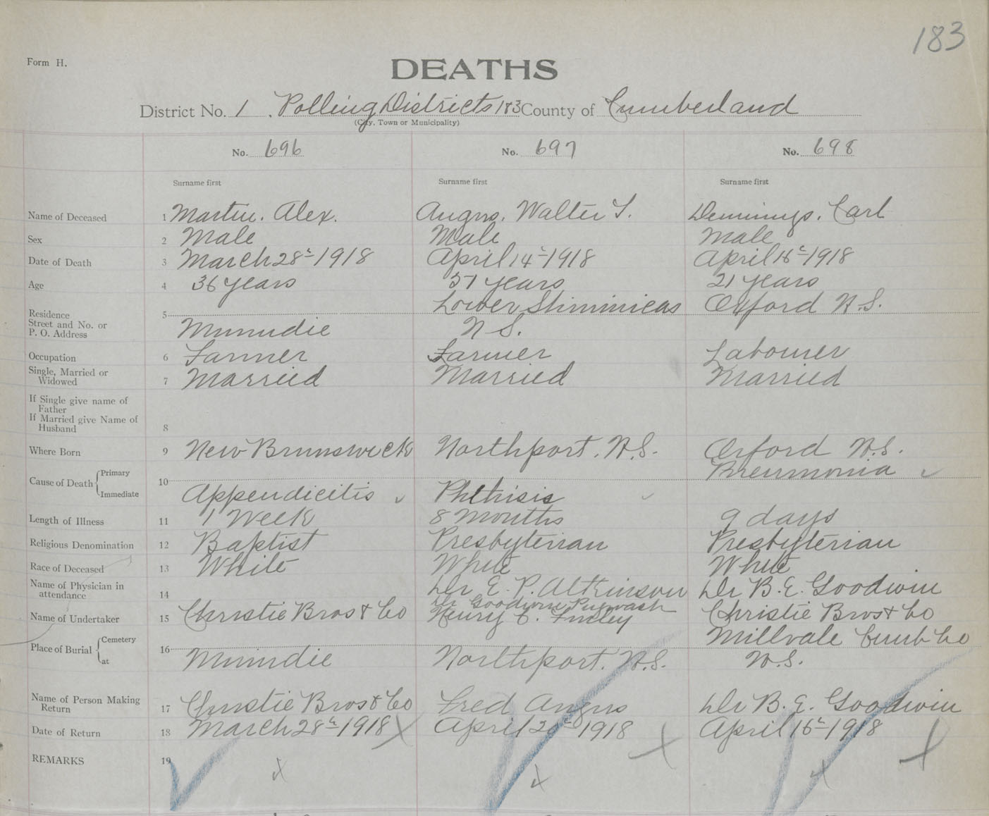 Male Death Registration: Year: 1918 book: 39 page: 183 number: 698