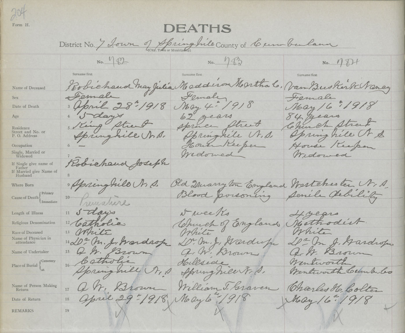 Female Death Registration: Year: 1918 book: 39 page: 204 number: 784