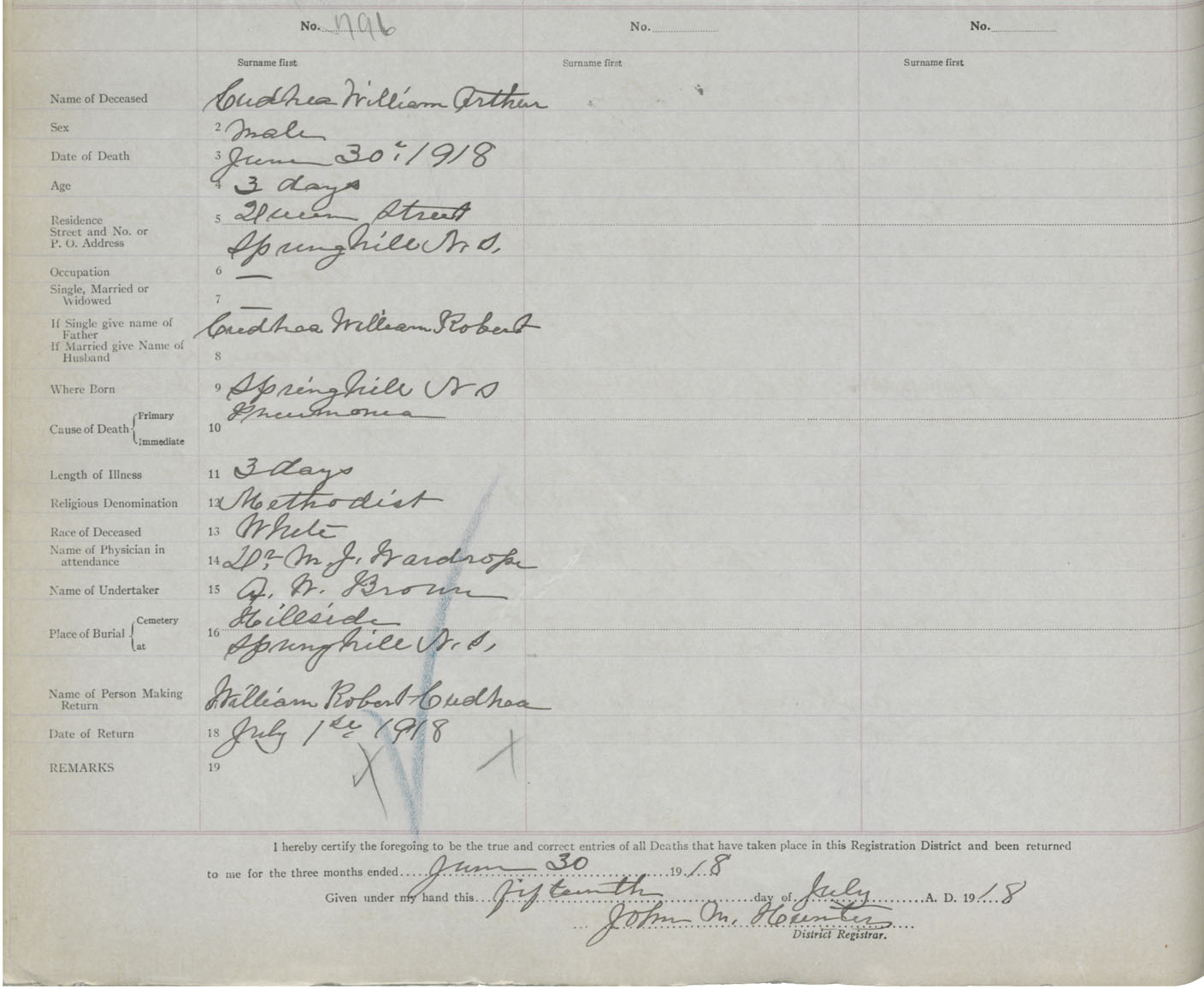 Male Death Registration: Year: 1918 book: 39 page: 206 number: 796