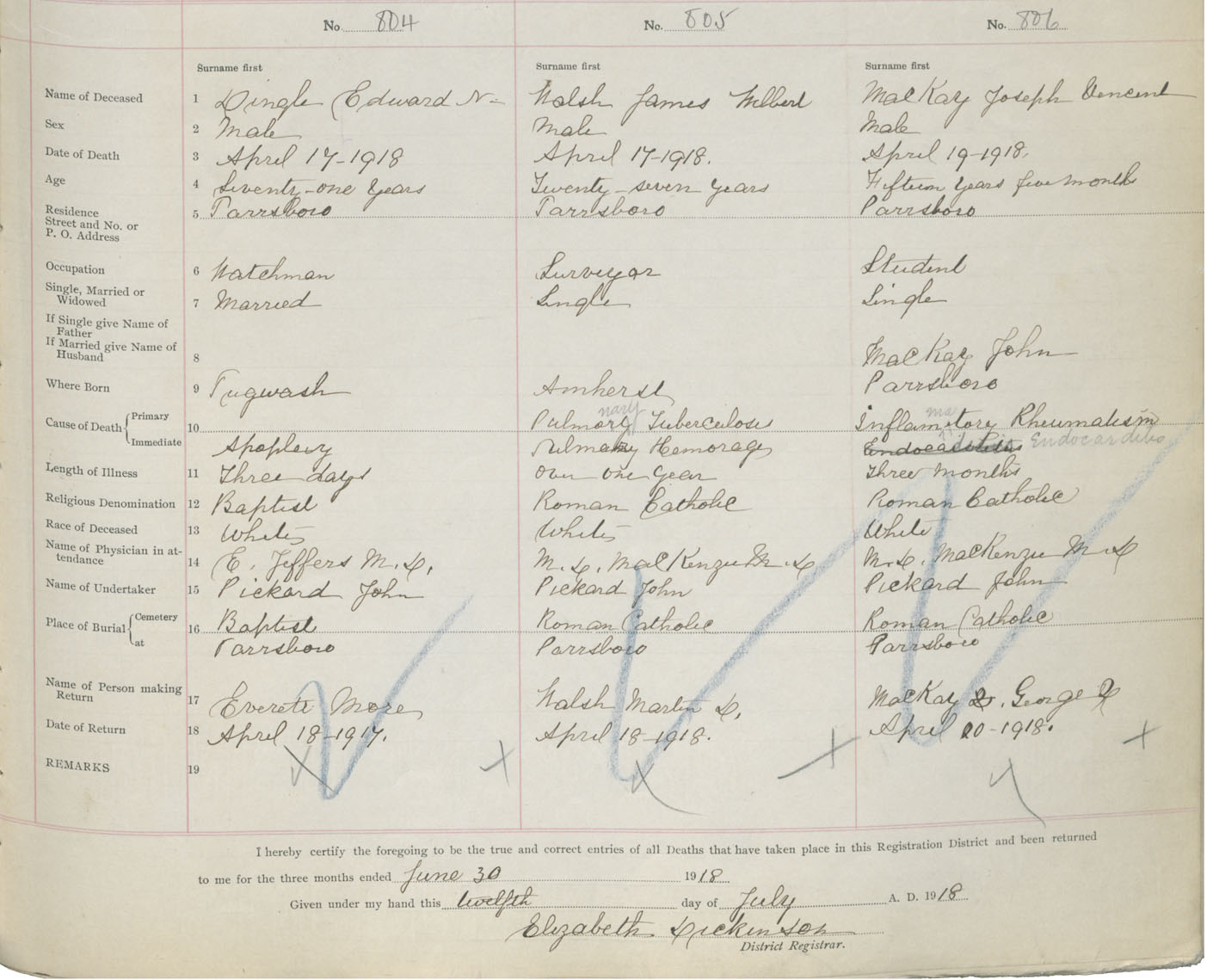 Male Death Registration: Year: 1918 book: 39 page: 209 number: 806