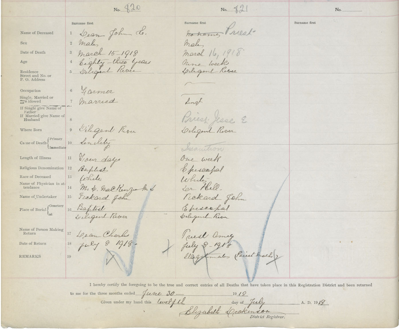 Male Death Registration: Year: 1918 book: 39 page: 212 number: 821