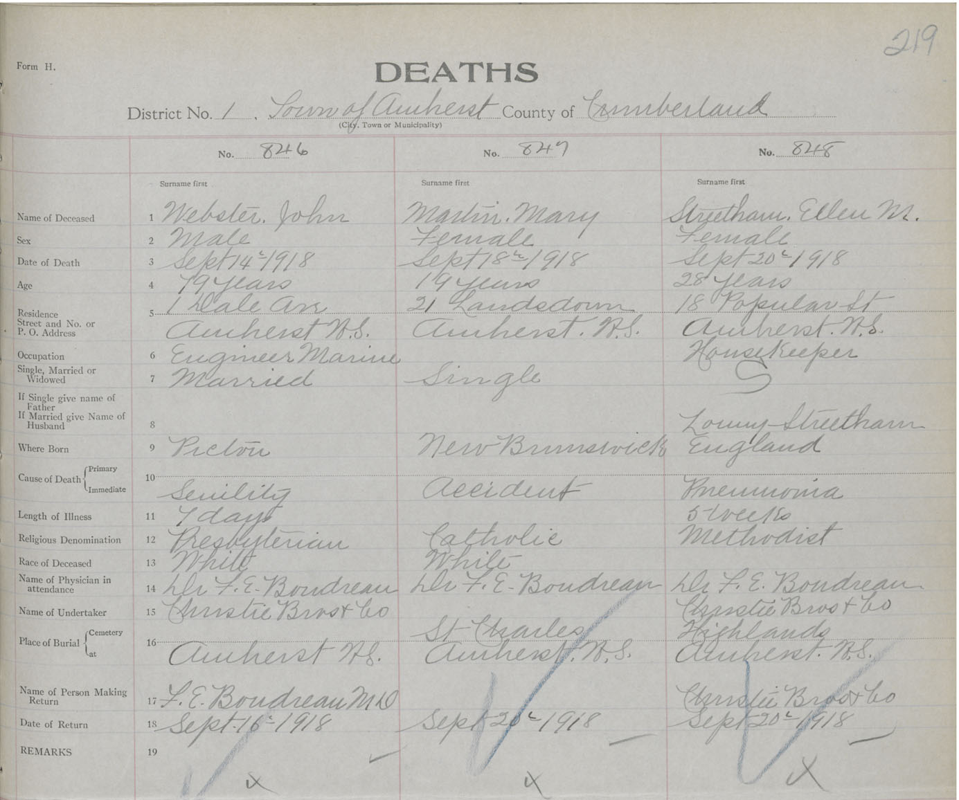 Female Death Registration: Year: 1918 book: 39 page: 219 number: 848