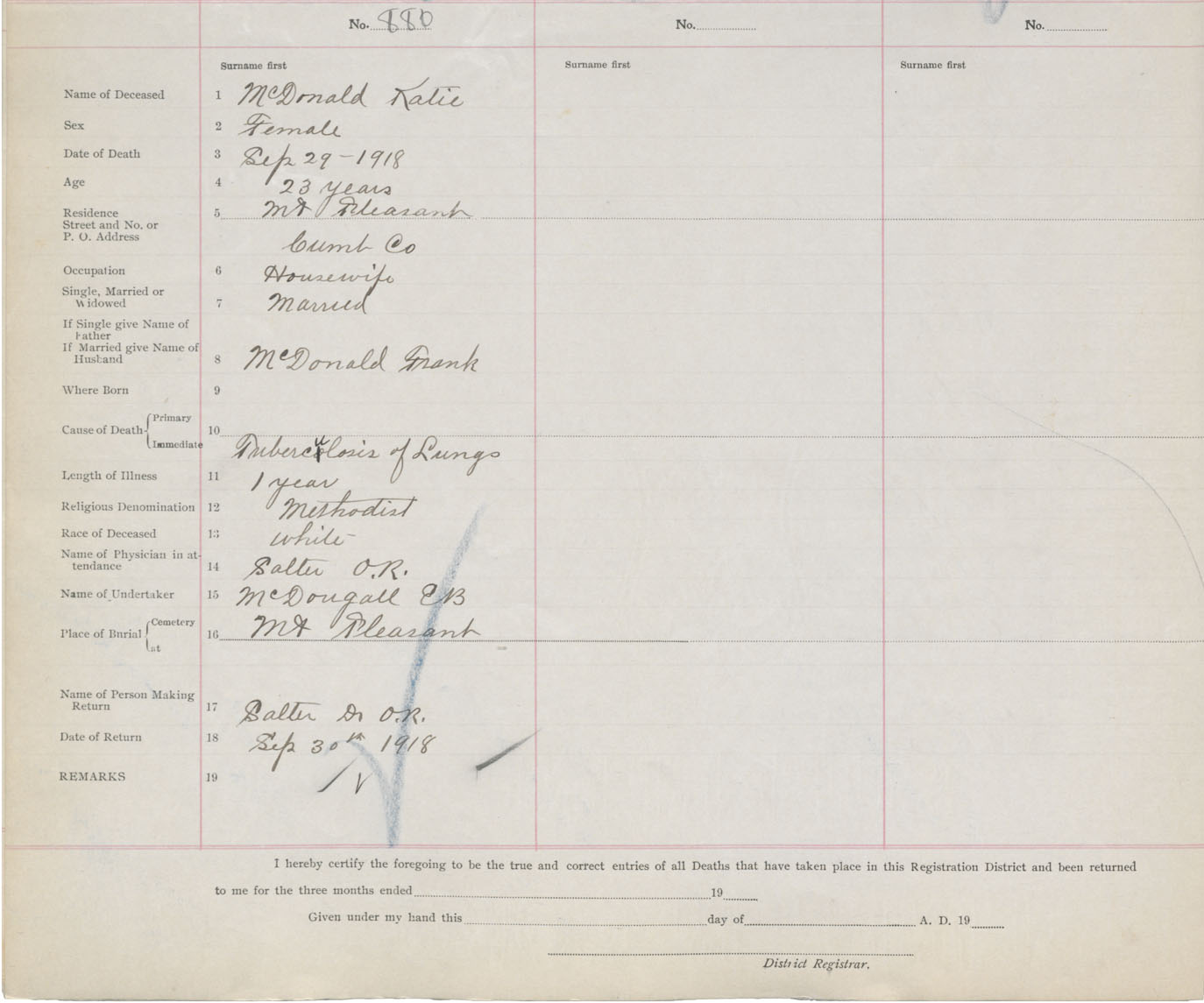 Female Death Registration: Year: 1918 book: 39 page: 228 number: 880