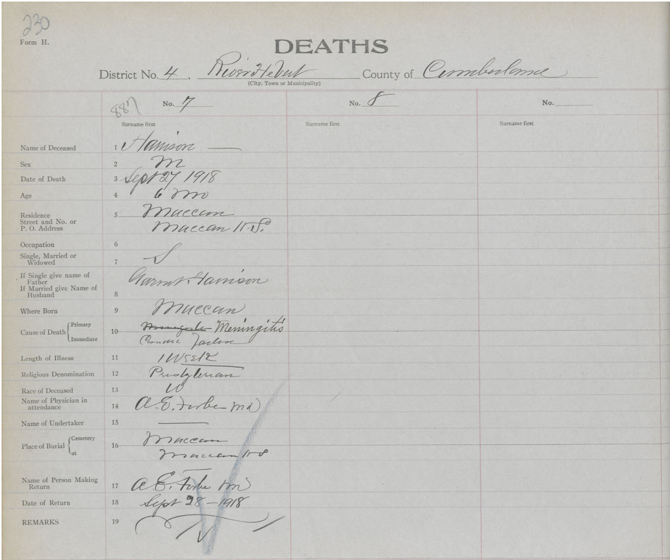 Male Death Registration: Year: 1918 book: 39 page: 230 number: 887