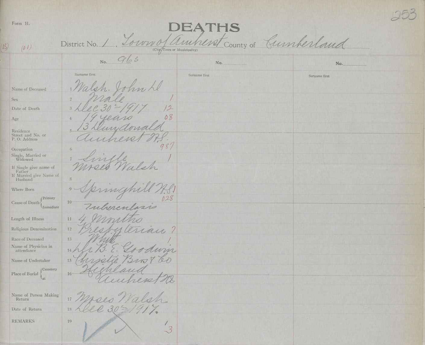 Male Death Registration: Year: 1917 book: 39 page: 253 number: 963