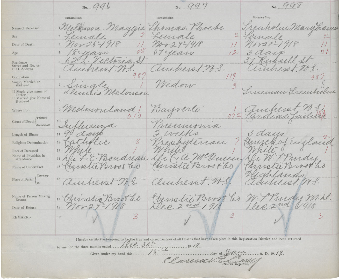 Female Death Registration: Year: 1918 book: 39 page: 260 number: 996