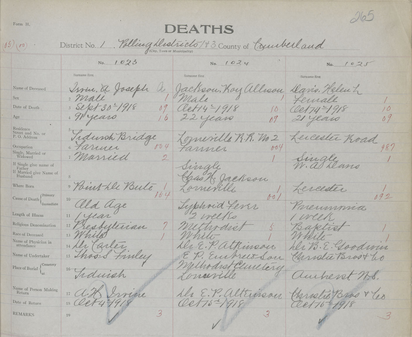 Male Death Registration: Year: 1918 book: 39 page: 265 number: 1023