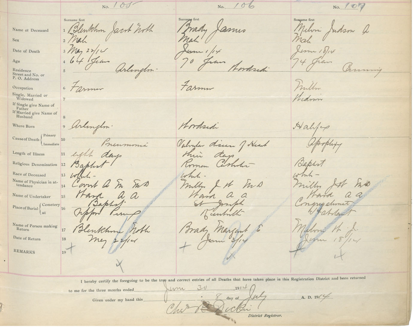 Male Death Registration: Year: 1914 book: 40 page: 27 number: 107