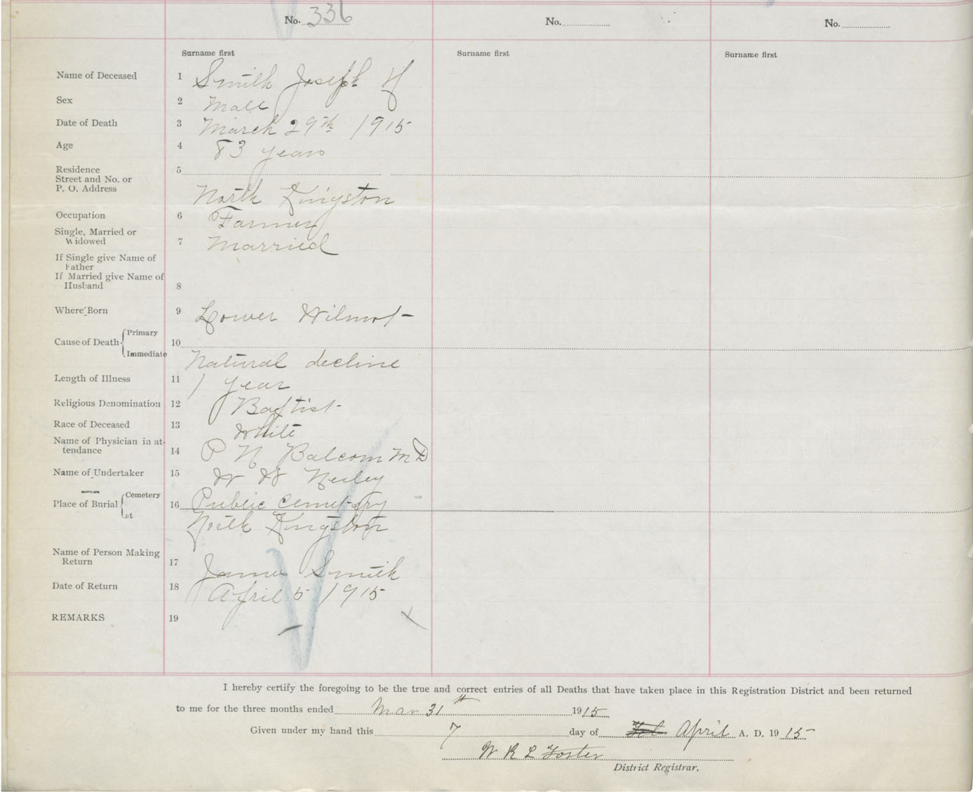 Male Death Registration: Year: 1915 book: 40 page: 88 number: 336