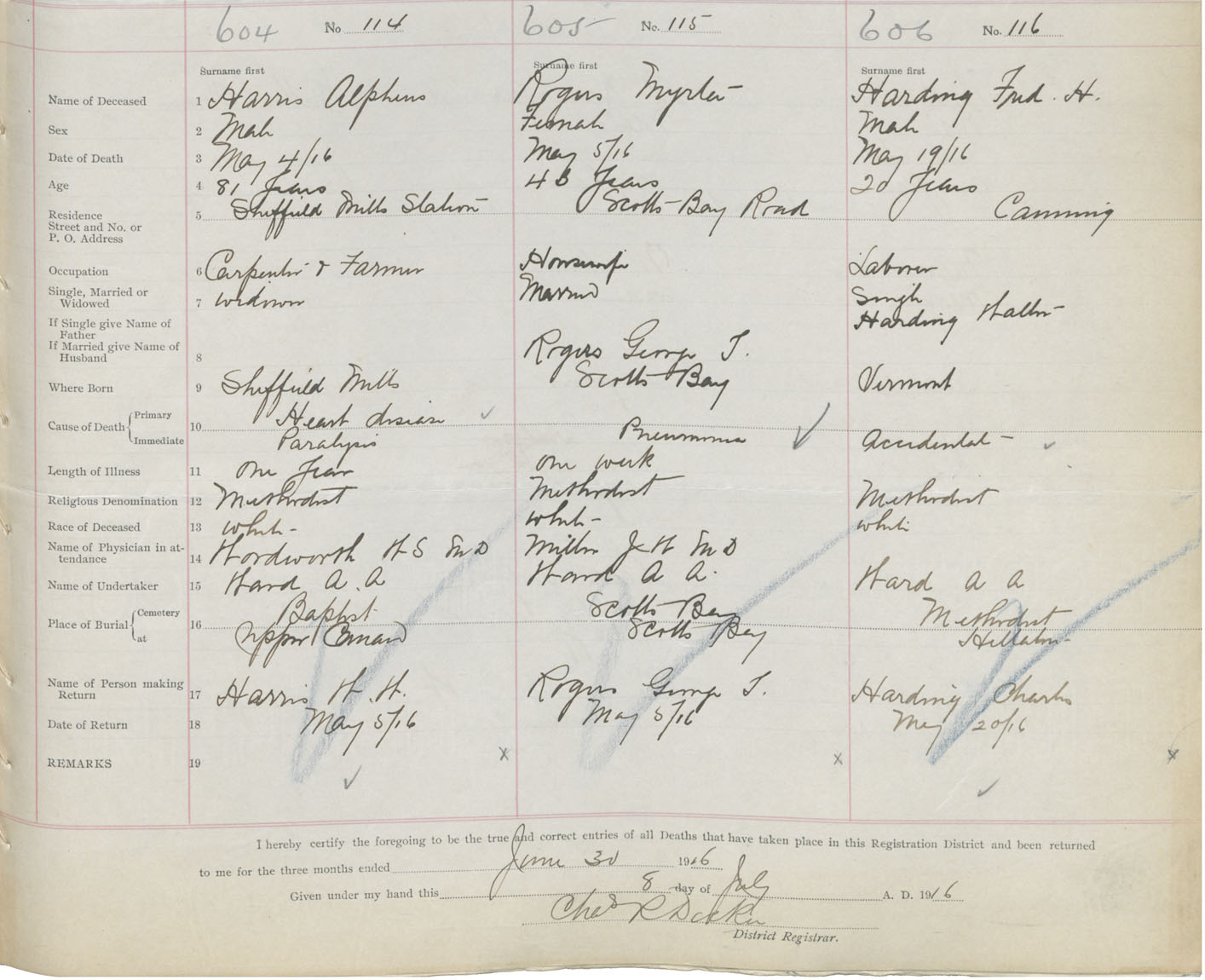 Male Death Registration: Year: 1916 book: 40 page: 161 number: 606