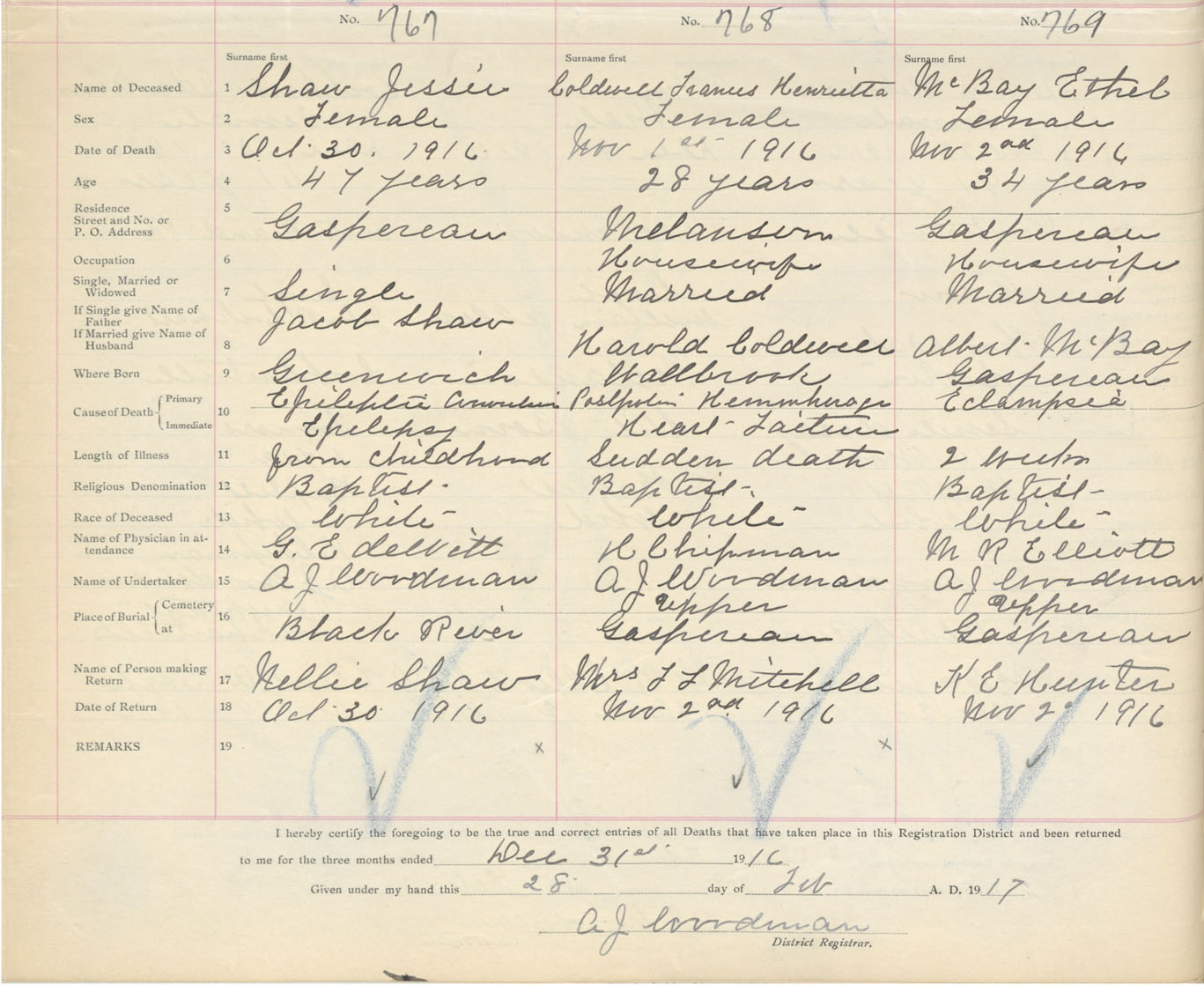 Female Death Registration: Year: 1916 book: 40 page: 204 number: 767