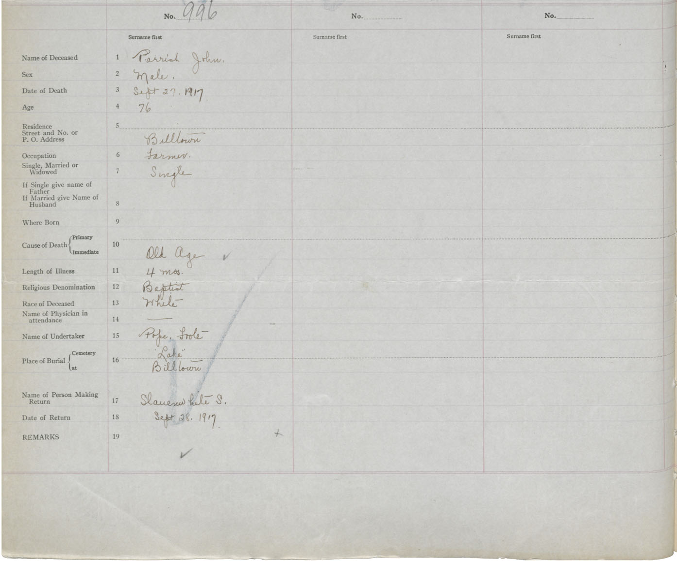 Male Death Registration: Year: 1917 book: 40 page: 364 number: 996