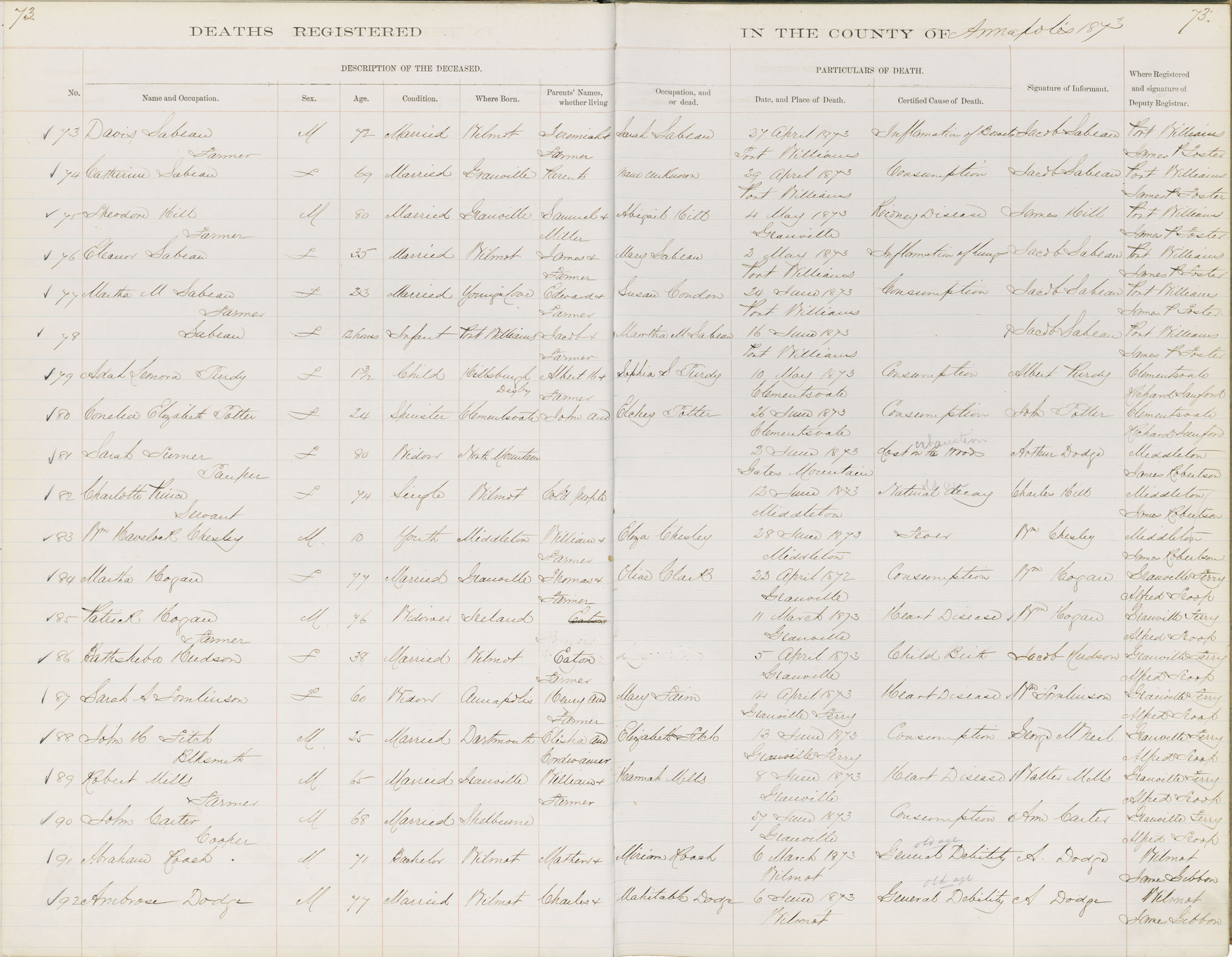 Death Registration: Year: 1873 book: 1801 page: 73 number: 73