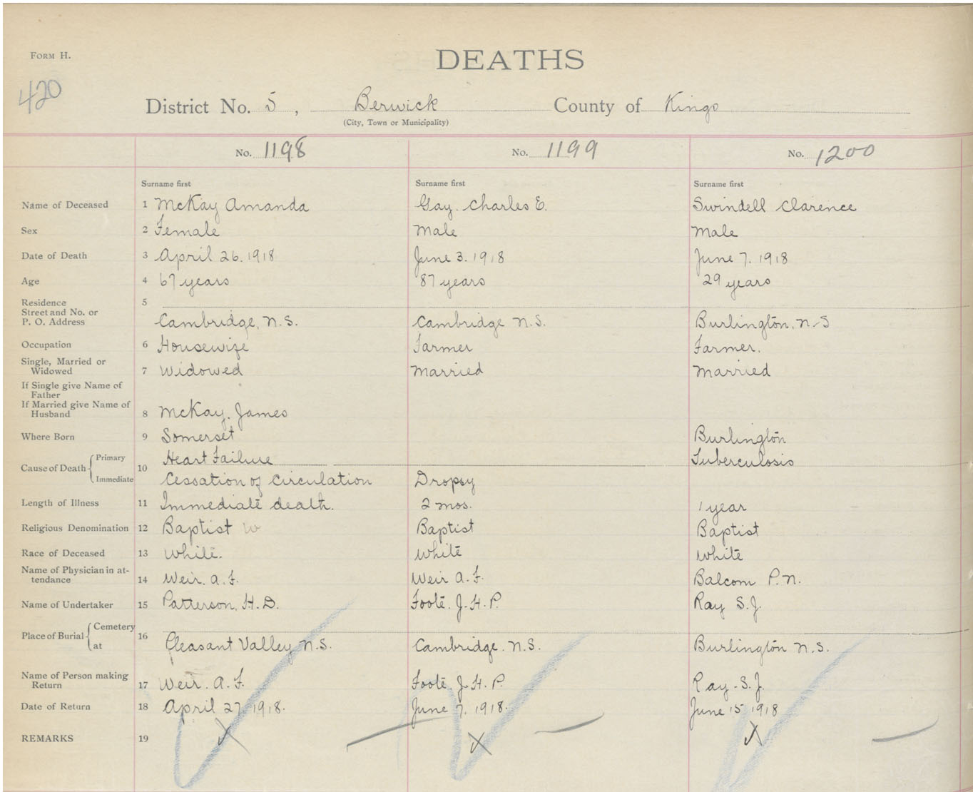Male Death Registration: Year: 1918 book: 40 page: 420 number: 1200