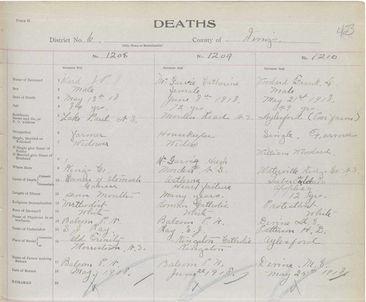 Male Death Registration: Year: 1918 book: 40 page: 423 number: 1210
