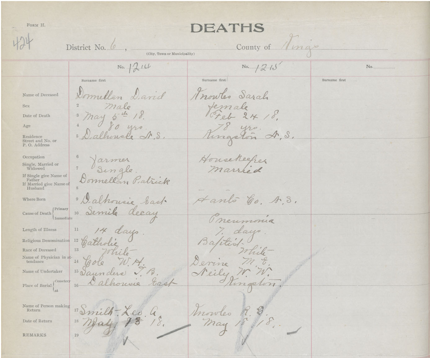 Female Death Registration: Year: 1918 book: 40 page: 424 number: 1215