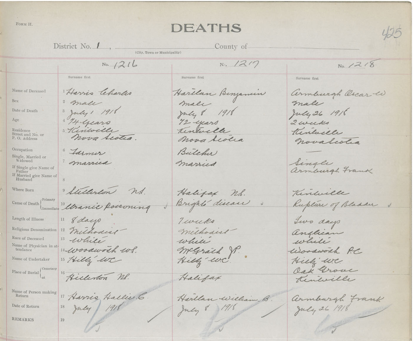 Male Death Registration: Year: 1918 book: 40 page: 425 number: 1218