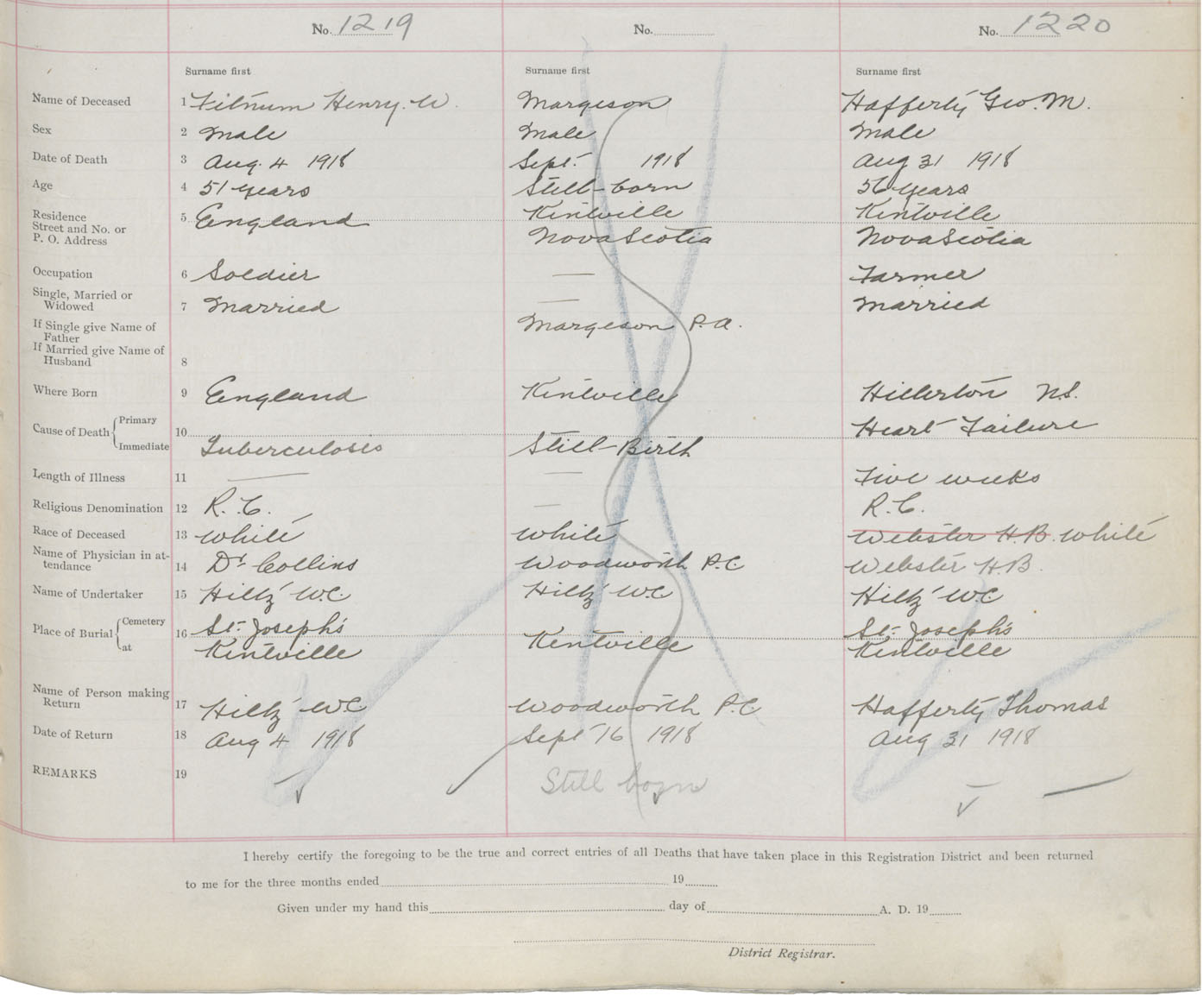 Male Death Registration: Year: 1918 book: 40 page: 425 number: 1220
