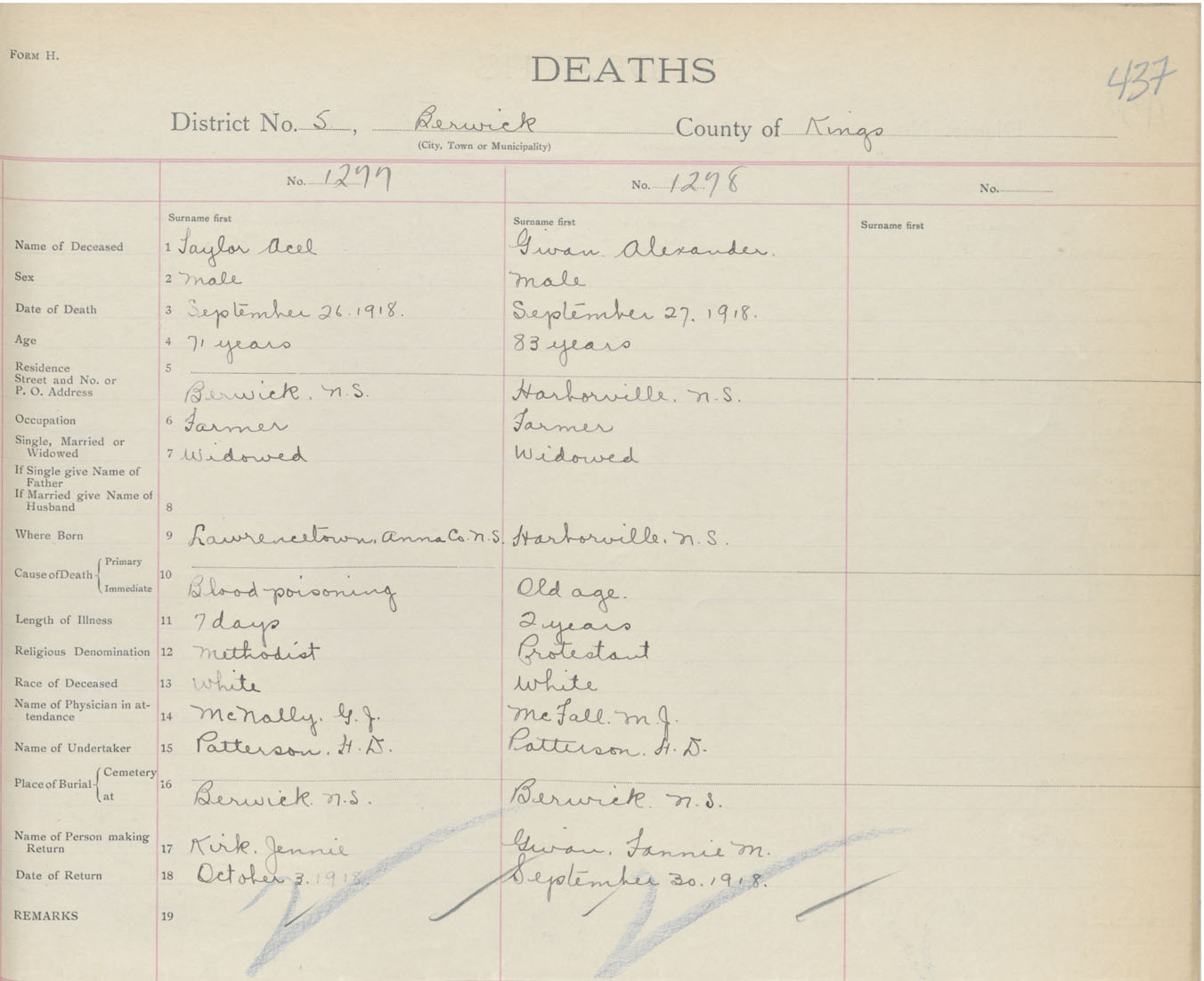 Male Death Registration: Year: 1918 book: 40 page: 437 number: 1278