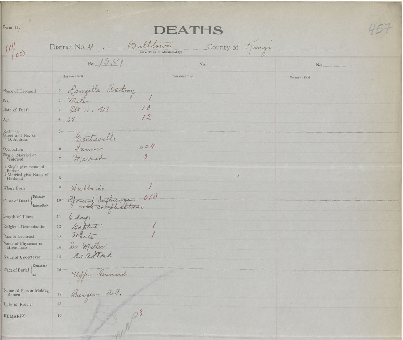 Male Death Registration: Year: 1918 book: 40 page: 457 number: 1351